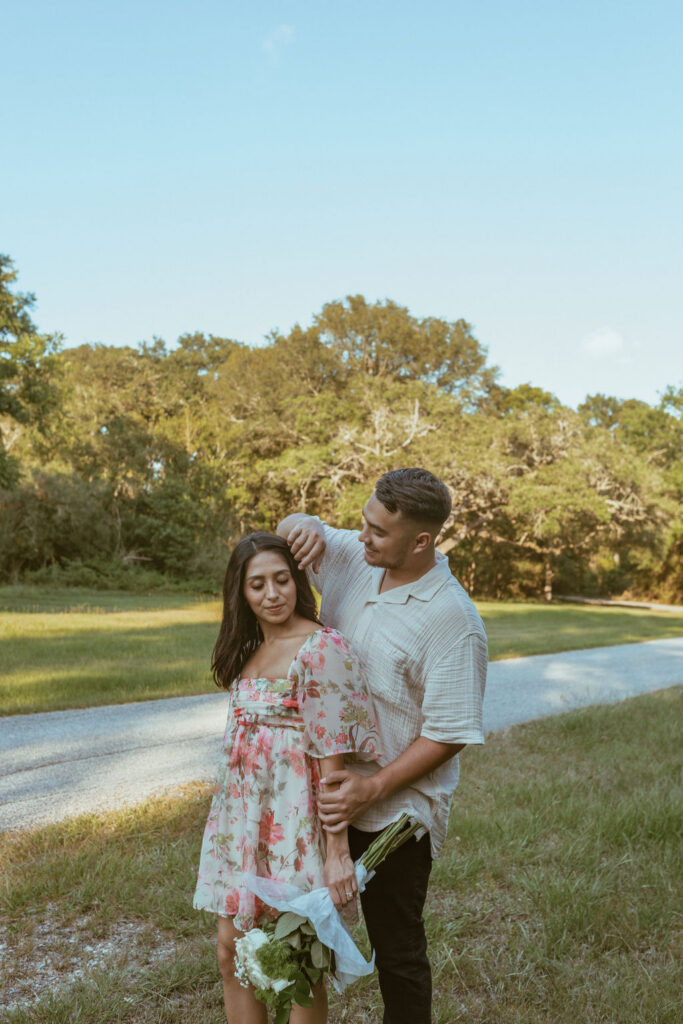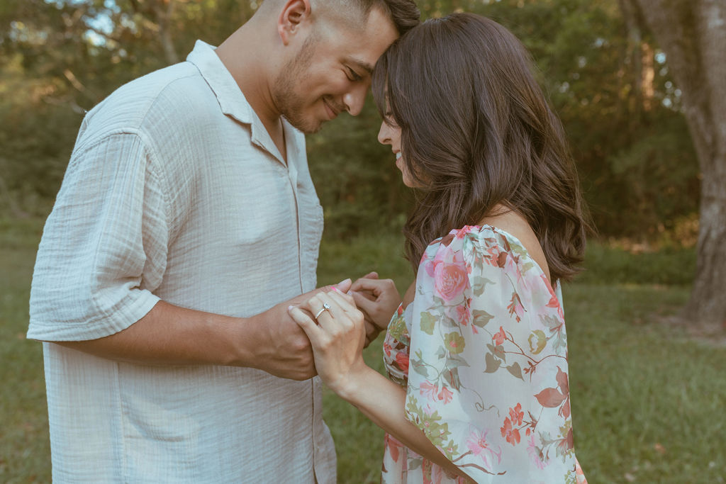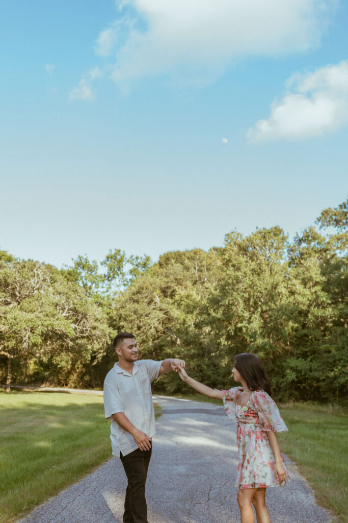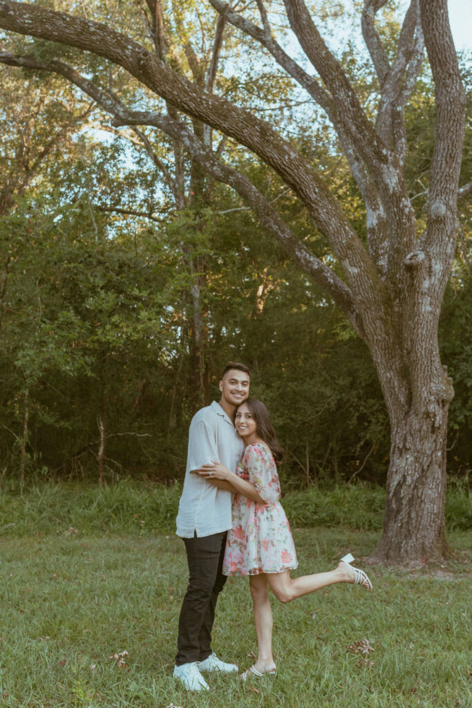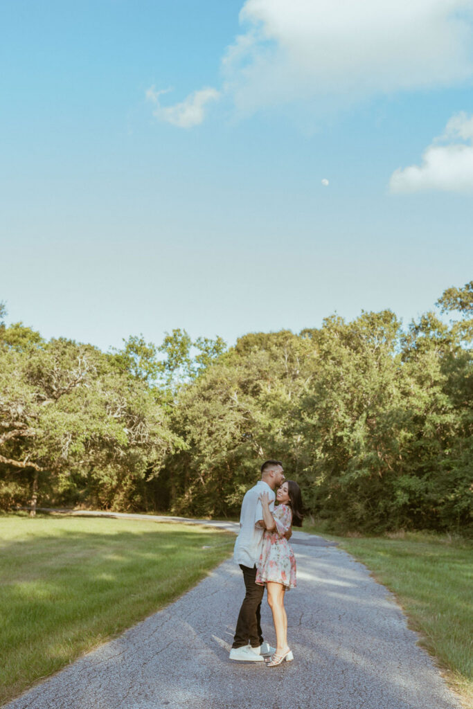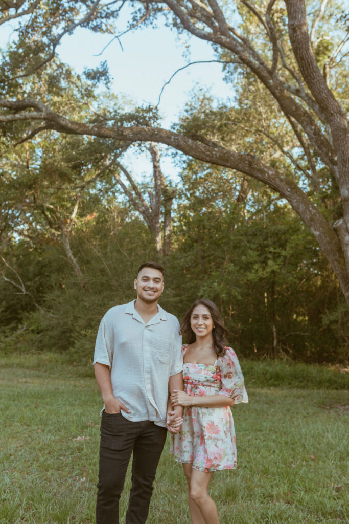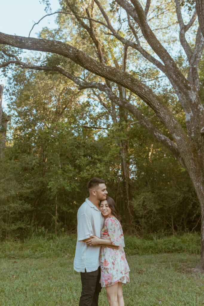 As an engagement photographer, I love when couples choose meaningful and pretty locations for their session. At Challenger Seven Memorial Park in Webster the tall trees and open green spaces make everything feel so calm. This location made Nayeli and Jesus photos look intimate and it made it so easy to document their relationship.