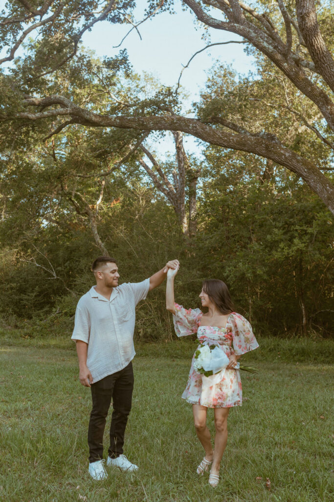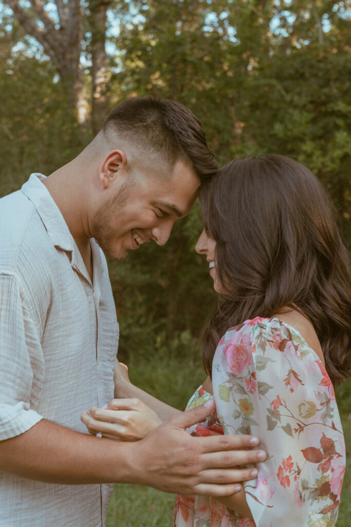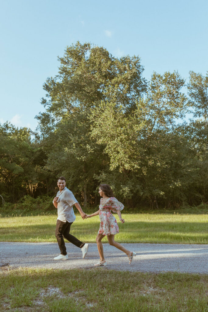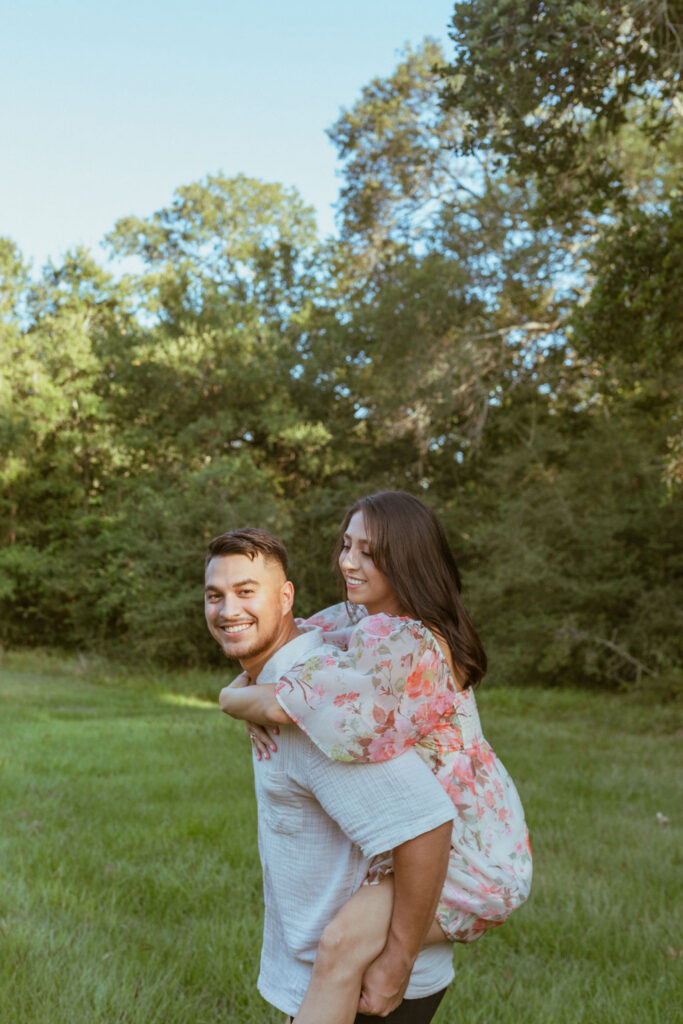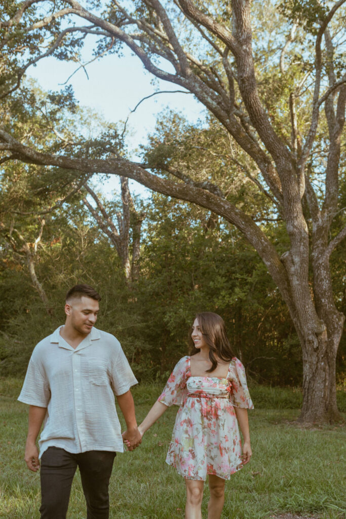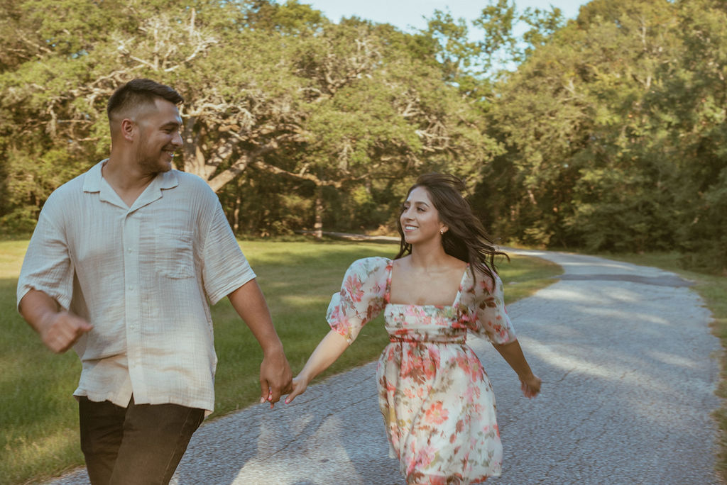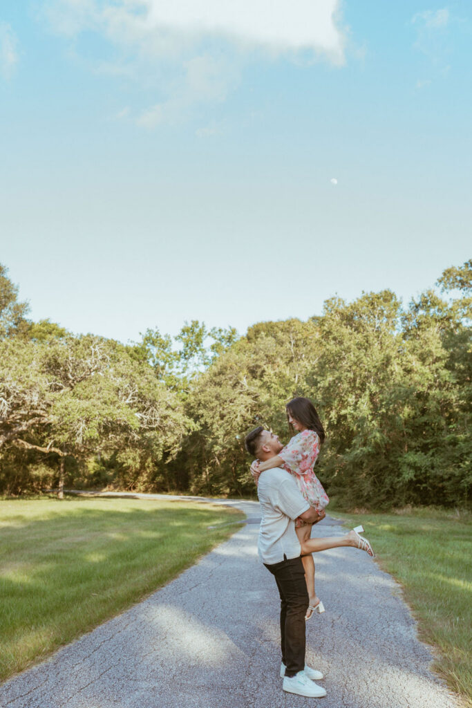 As an engagement photographer, I love when couples choose meaningful and pretty locations for their session. At Challenger Seven Memorial Park in Webster the tall trees and open green spaces make everything feel so calm. This location made Nayeli and Jesus photos look intimate and it made it so easy to document their relationship.