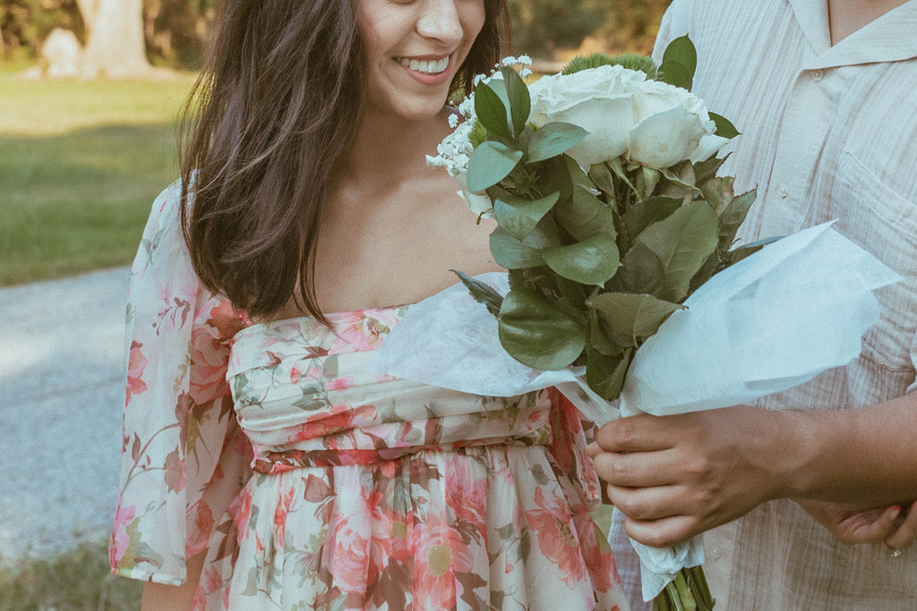 Adding props to your engagement session can really make a big difference. Props like bouquets, hats, blankets, or even a cute picnic setup can help tell your love story. They also give your hands something to do, which helps you feel less awkward.